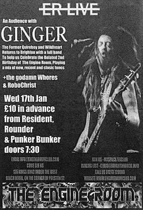 Flyer for Ginger live at the Engine Room, Brighton, 17 January 2007The last train home would be leaving at 11.37pm. Pretty good. The gig, at Brighton’s Engine Room on the seafront, was bound to be over by 11pm, so I should have had plenty of time for a leisurely stroll back to the station. And I probably would have if Ginger’s car hadn’t broken down en route to the venue (the word ‘diesel’ was tossed about), leaving a roomful of fans anxiously eyeing their watches.